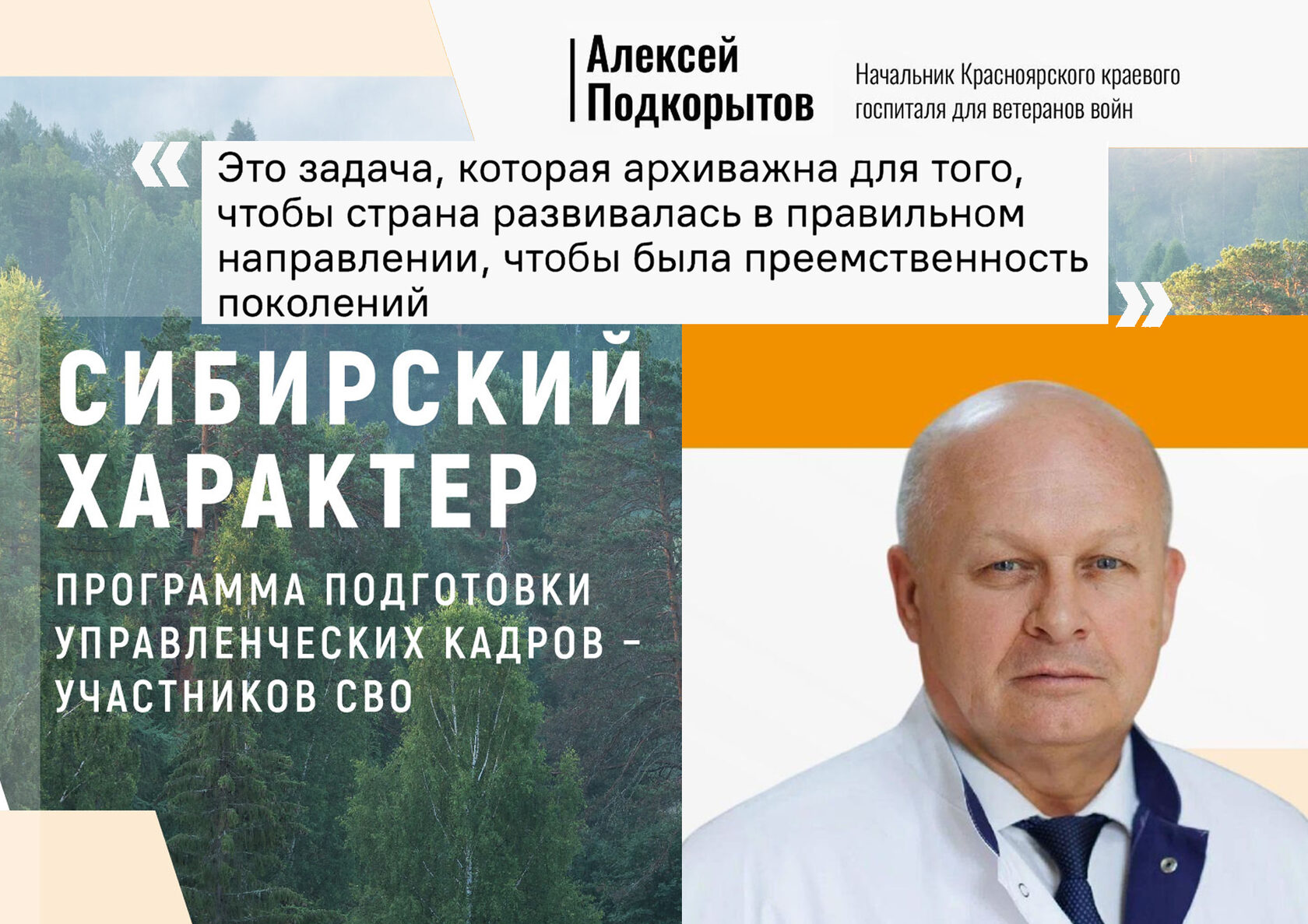 Участник Общественного совета программы «Сибирский характер» начальник Красноярского краевого госпиталя для ветеранов войн Алексей Подкорытов рассказал о важности подготовки высококлассных руководителей всех уровней в развитии Красноярского края.